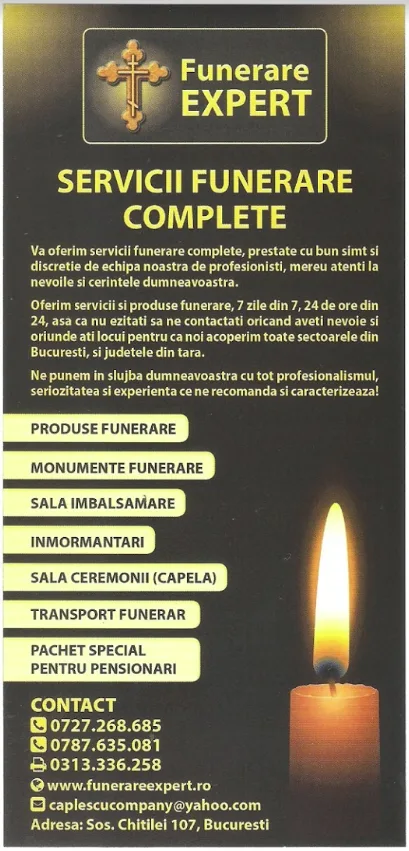 Pompe Funebre FUNERARE EXPERT va ofera consiliere si servicii funerare necesare in organizarea ceremoniei de ultim ramas bun pentru ca persoana pierduta sa aiba parte de o inmormantare decenta: transport si manipulare sicriu, toaletare decedat, sicrie, accesorii si articole funerare: prosoape, batiste, esarfe, doliu,lumanari, candele, manere sicriu, urne, respete etc, repatriere decedati, capela, cruce lemn sicriu, monumente funerare, marmura si granit, ingrjire amenajare mormant, organizare parastas pomana, transport funerar, pachete funerare, coroane si jerbe funerare, aranjamente florare funerare, imbalsamare, tanatopraxie, sicrie de lux, ajutor deces, capac frigorific.